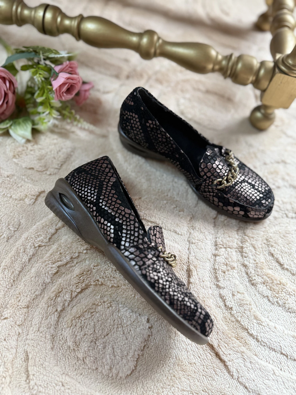 Mocasín de cuero con detalle de cadena un calzado que combina elegancia y confort. Este modelo cuenta con una base ultra liviana que asegura un uso prolongado sin sacrificio de la comodidad. Su diseño en talle 36 se adapta perfectamente a tu pie, mientras que el detalle de cadena dorada agrega un toque distintivo y sofisticado. Ideal para cualquier ocasión, desde reuniones formales hasta salidas informales. ¡No esperes más y adquiere el tuyo hoy mismo!