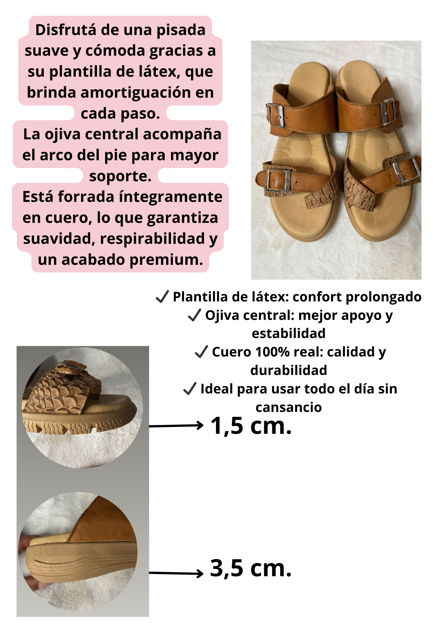 Descubre la sofisticación de nuestras sandalias en cuero color suela y regulables. Con una base forrada en cuero y una plantilla súper mullida, cada paso será un placer. La ojiva en el centro y el latex aportan un toque de distinción y confort excepcional.